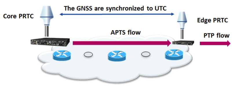 APTS synchronizes the core PRTC with the edge PRTC using PTP. The PTP flow into the edge PRTC is calibrated using the local GNSS, which is the same time reference (UTC) as the core GNSS.